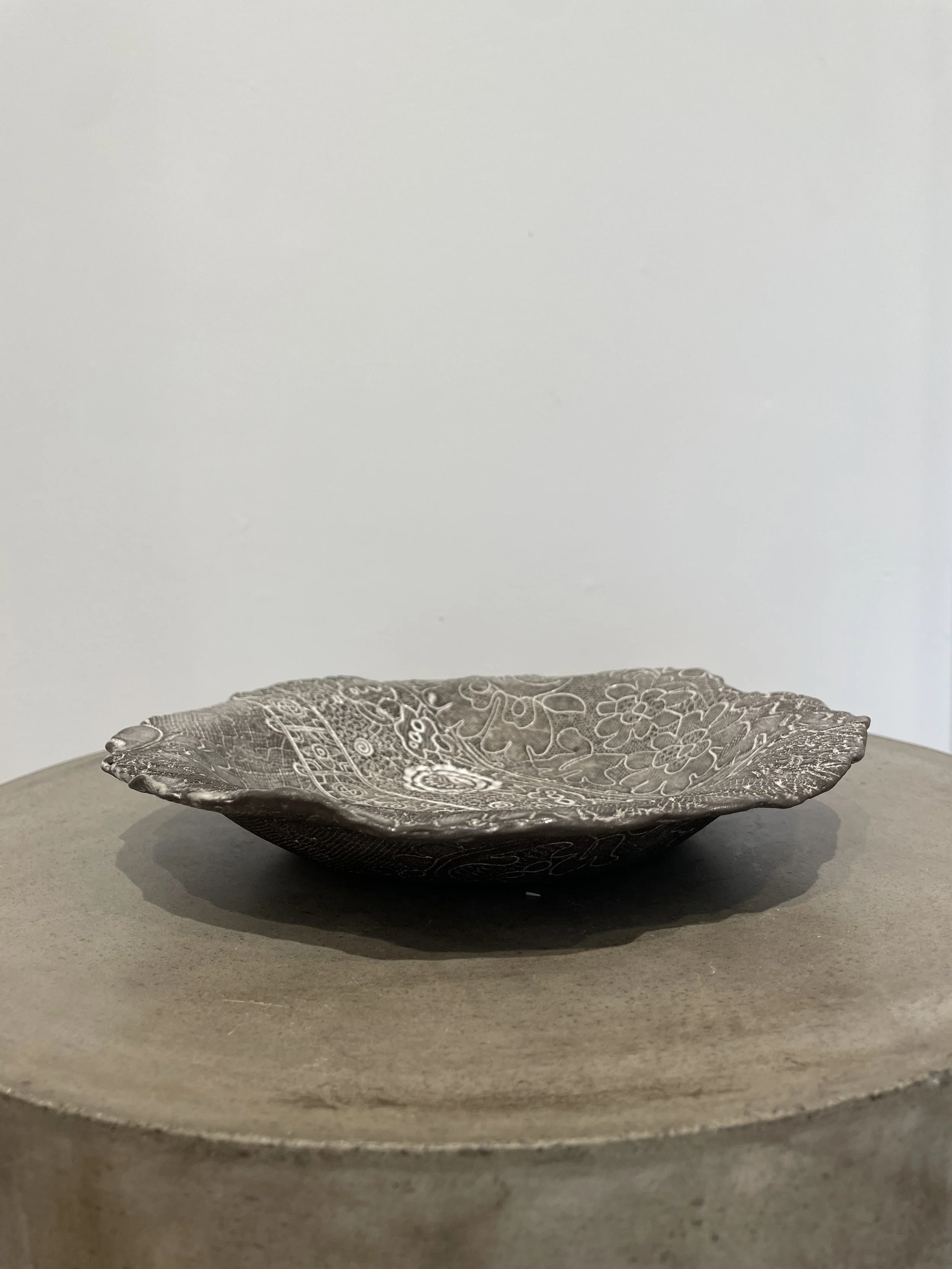 Hand thrown french black clay soup bowls created in Valerie Casado’s atelier in Isle sur la Sorgue, France. Casado creates impressions of vintage lace on each piece. Handmade in France.